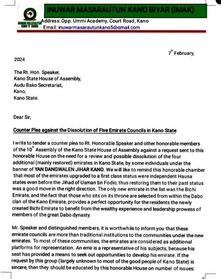 Wata kungiya mai suna Inuwar Masarautun Kano Biyar (IMAK) ta yi kira ga majalisar dokokin jihar Kano da ta yi watsi da rokon wata kungiya mai suna ‘Yan Dagwalen Kano – wadda a baya-bayan nan ta bukaci a rusa masarautun jihar guda hudu tare da mayar da tsohon sarki Khalipha Sanusi Lamido Sanusi.